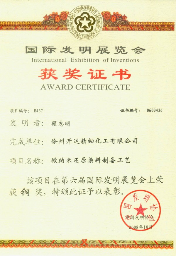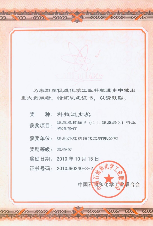 公司擁有“江蘇省蒽醌型還原染料工程技術(shù)研究中心”、“省級(jí)企業(yè)技術(shù)中心”和“江蘇省研究生工作站”;先后被授予“中國(guó)化工行業(yè)自主創(chuàng)新能力十強(qiáng)”單位、“中國(guó)化工行業(yè)技術(shù)創(chuàng)新示范企業(yè)”、“全國(guó)企事業(yè)知識(shí)產(chǎn)權(quán)試點(diǎn)單位”,“省知識(shí)產(chǎn)權(quán)管理示范單位”,多個(gè)品種先后獲得了“國(guó)家重點(diǎn)新產(chǎn)品”和“省高新技術(shù)產(chǎn)品”認(rèn)定;并取得國(guó)際三大認(rèn)證監(jiān)測(cè)中心之一的天祥公司授予符合國(guó)際生態(tài)要求的“染料生態(tài)安全證書(shū)”和國(guó)際紡織品檢定標(biāo)準(zhǔn)起草單位授予的ECO-PASSPORT證書(shū),產(chǎn)品符合國(guó)際生態(tài)環(huán)保的要求,并具有超細(xì)、高濃、印染加工條件寬容性好,印染三廢排放少等特點(diǎn),深受?chē)?guó)內(nèi)外客戶(hù)的歡迎。
