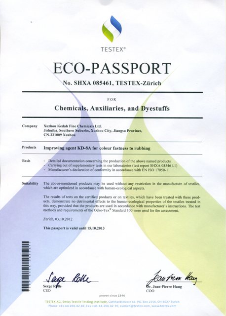 2011-2012年,我公司主要產(chǎn)品開(kāi)達(dá)士林橄欖T、干、濕摩擦牢度提升劑KD-8A在TESTEX瑞士紡織檢定有限公司(國(guó)際環(huán)保紡織協(xié)會(huì)(Oeko-Tex Association)秘書(shū)處)進(jìn)行了生態(tài)安全認(rèn)證,獲得了生態(tài)認(rèn)證合格證書(shū)。