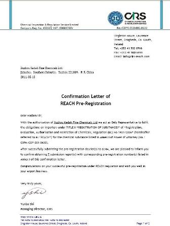 按照歐盟REACH法規(guī)對化學(xué)品的監(jiān)管要求,取得了REACH預(yù)注冊、后預(yù)注冊證書,取得了公司主要產(chǎn)品在歐盟市場營銷的資格。