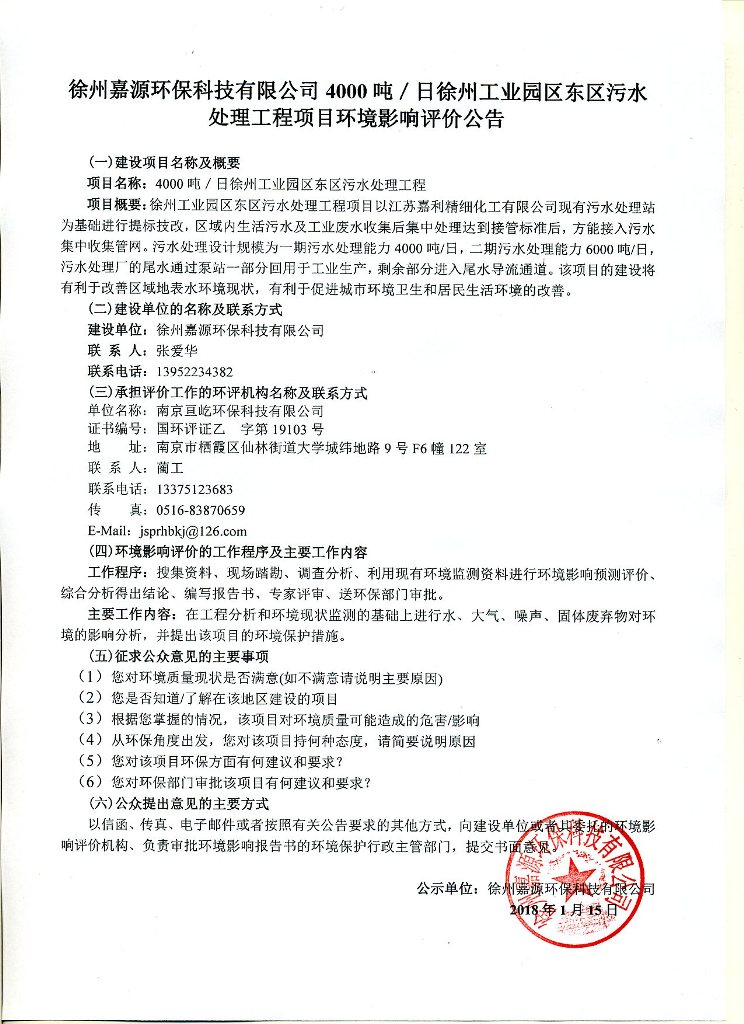 4000噸/日徐州工業(yè)園區(qū)東區(qū)污水處理工程項(xiàng)目環(huán)評(píng)公告
